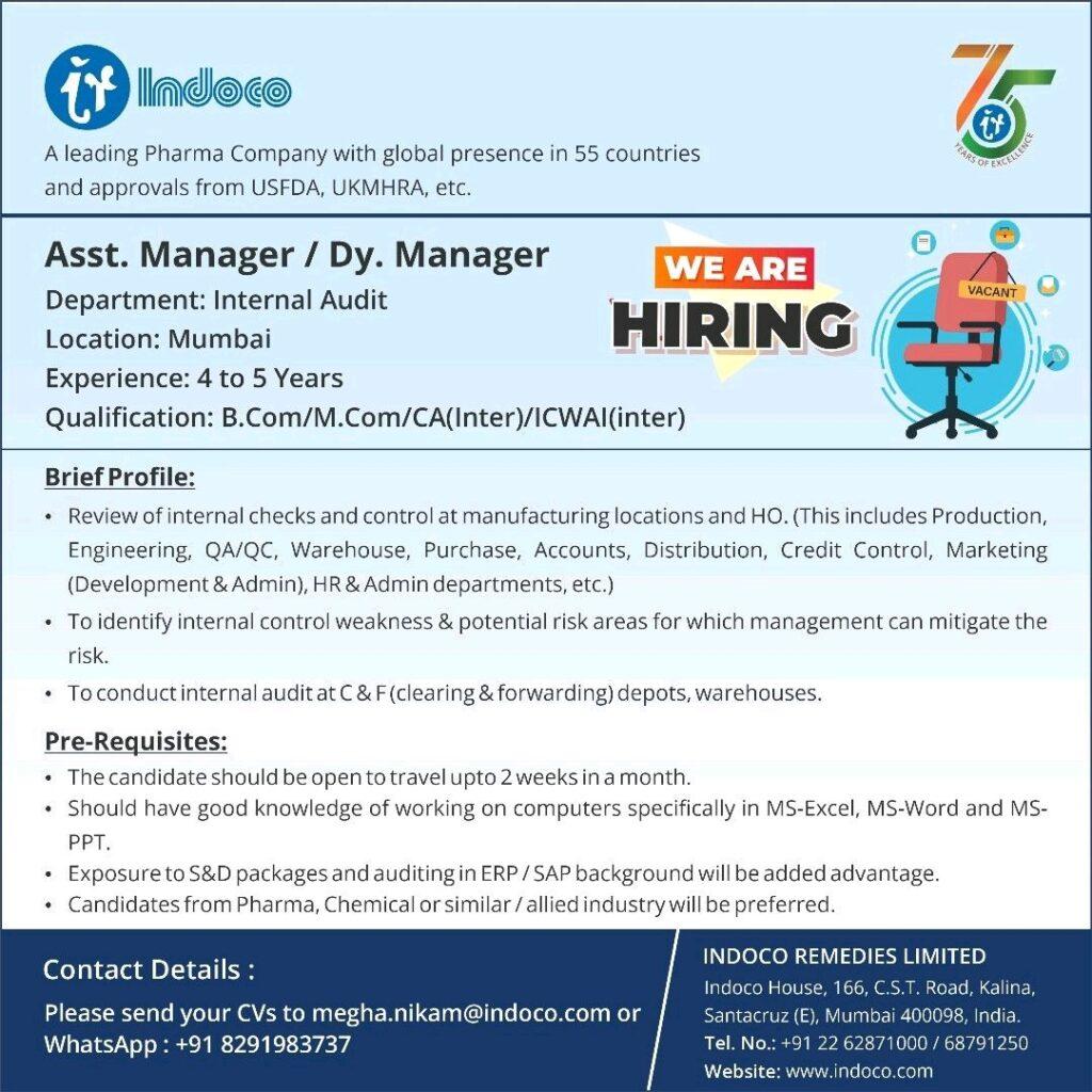 INDOCO REMEDIES hiring Asst. Manager / Dy. Manager- Internal Audit