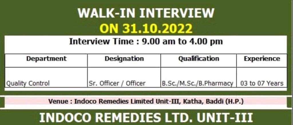 Indoco Remedies Limited Walk In Interview for Quality Control department on 31/10/2022