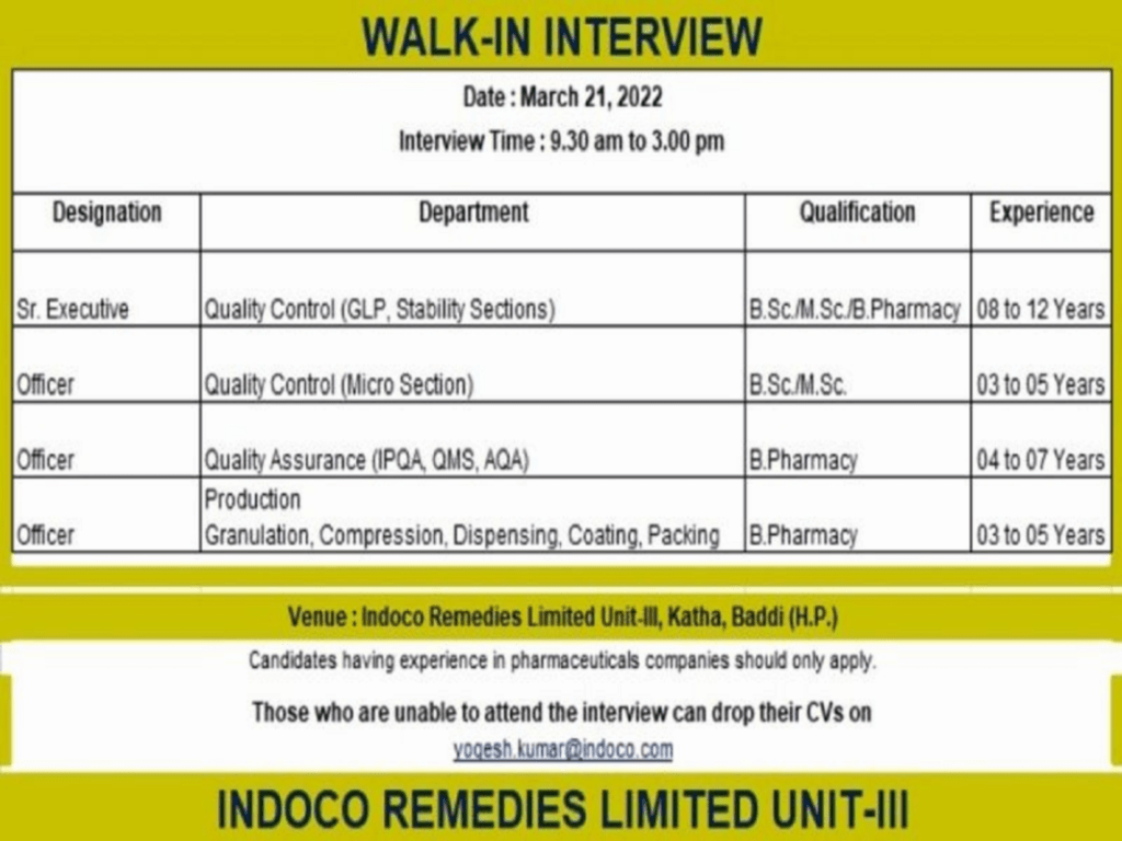 Those who are unable to attend the interview can drop their CVs on yogesh.kumar@indoco.com