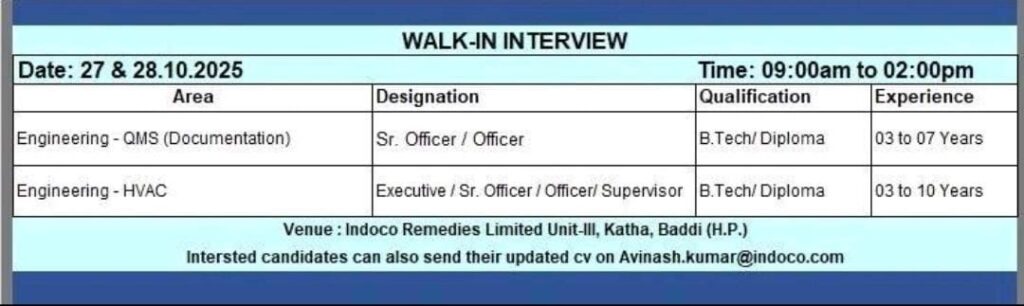 Indoco Remedies Limited, a renowned pharmaceutical company, is conducting a Walk-in Interview for experienced professionals in its Engineering Department at Unit-III, Katha, Baddi (Himachal Pradesh). This is a great opportunity for skilled candidates with experience in QMS Documentation and HVAC systems to join one of India’s leading pharma organizations.