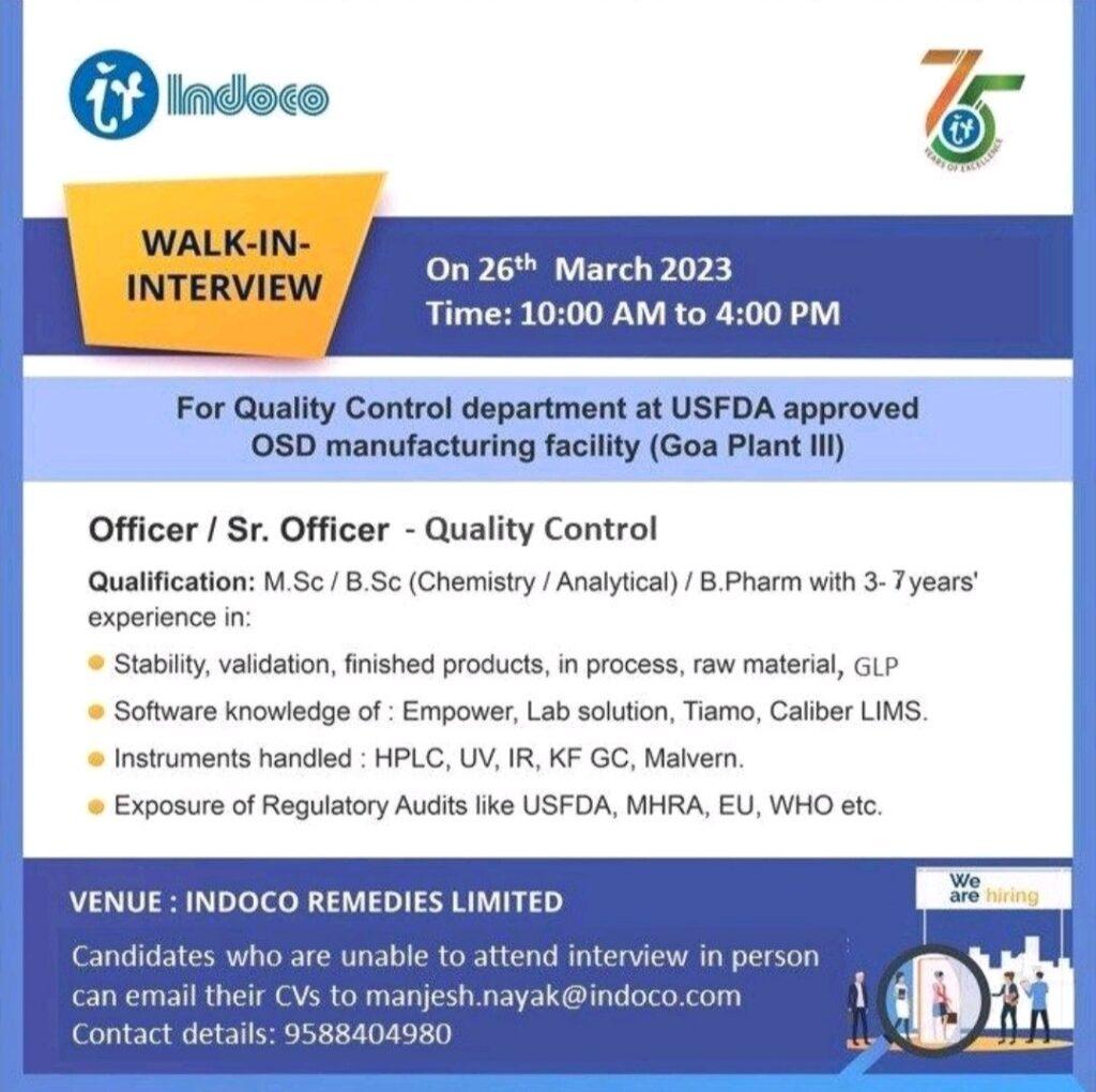 INDOCO REMEDIES- Walk In Interview at USFDA approved OSD manufacturing facility (Goa Plant III) on 26th March 2023