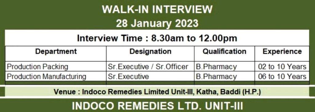 Indoco Remedies – Walk in interview for Production Packing, Production Manufacturing on 28 January, 2023 @Baddi