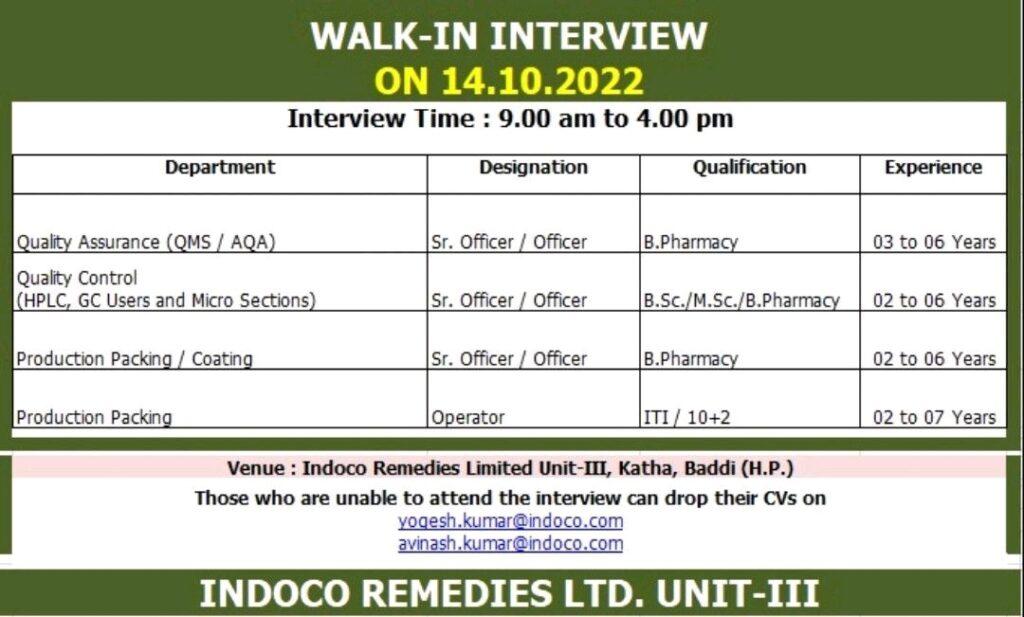 Those who are unable to attend the interview can drop their CVs on yogesh.kumar@indoco.com