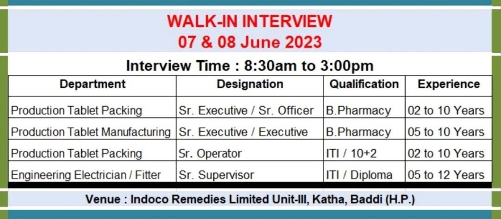 Walk in interview on 07 & 08 June, 2023 @ Indoco Remedies limited Unit III, Baddi.