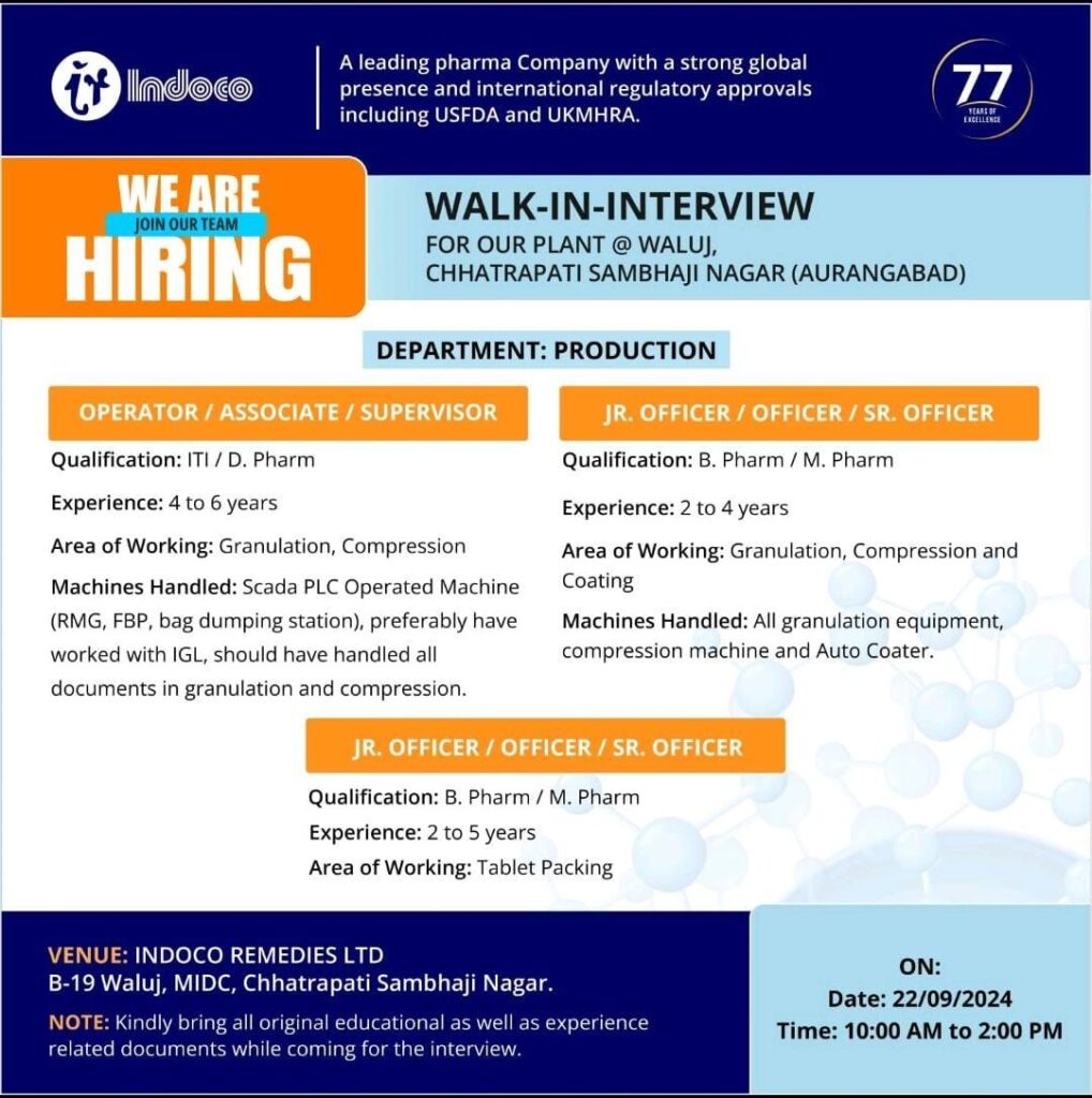 Indoco Remedies Ltd. Walk in interview for operator to sr. officer in Production & Packing department on Sunday, September 22, 2024