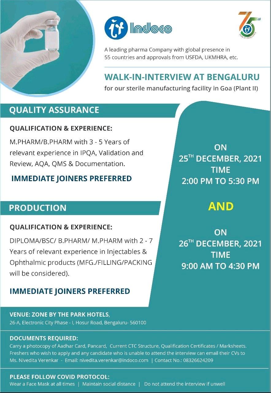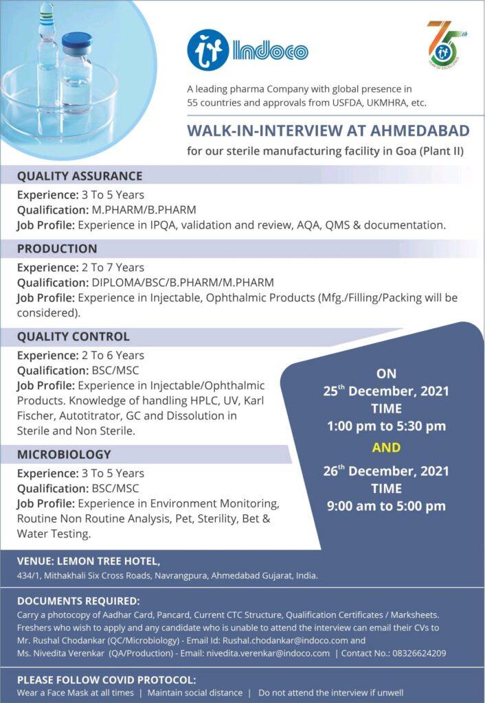 Indoco, Walk In Interview for Production/ QA/ QC/ Microbiology on 25th & 26th Dec’21 @Ahmedabad, Bengaluru