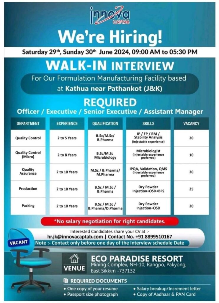 Innova Captab Ltd walk in interview for QA, QC, Microbiology, Production & Packing on Saturday 29th, Sunday 30th June 2024