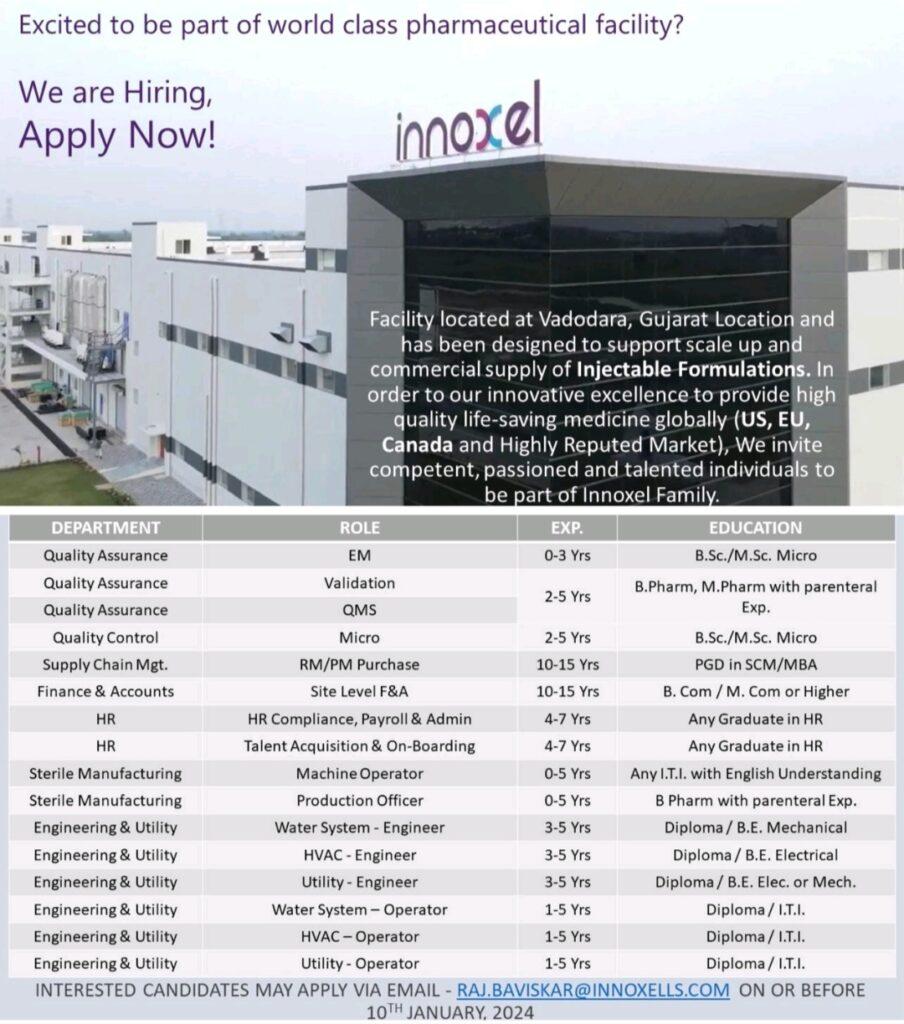 Innoxel job vacancy in QA, QC, Supply Chain Mgt., Finance & Accounts, HR, Sterile Manufacturing & Engineering department
