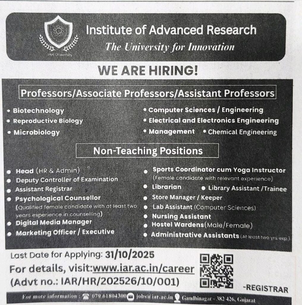 The Institute of Advanced Research (IAR), Gandhinagar – The University for Innovation – has announced exciting job opportunities for both teaching and non-teaching positions. The university invites applications from qualified and motivated candidates to join its dynamic academic and administrative team.