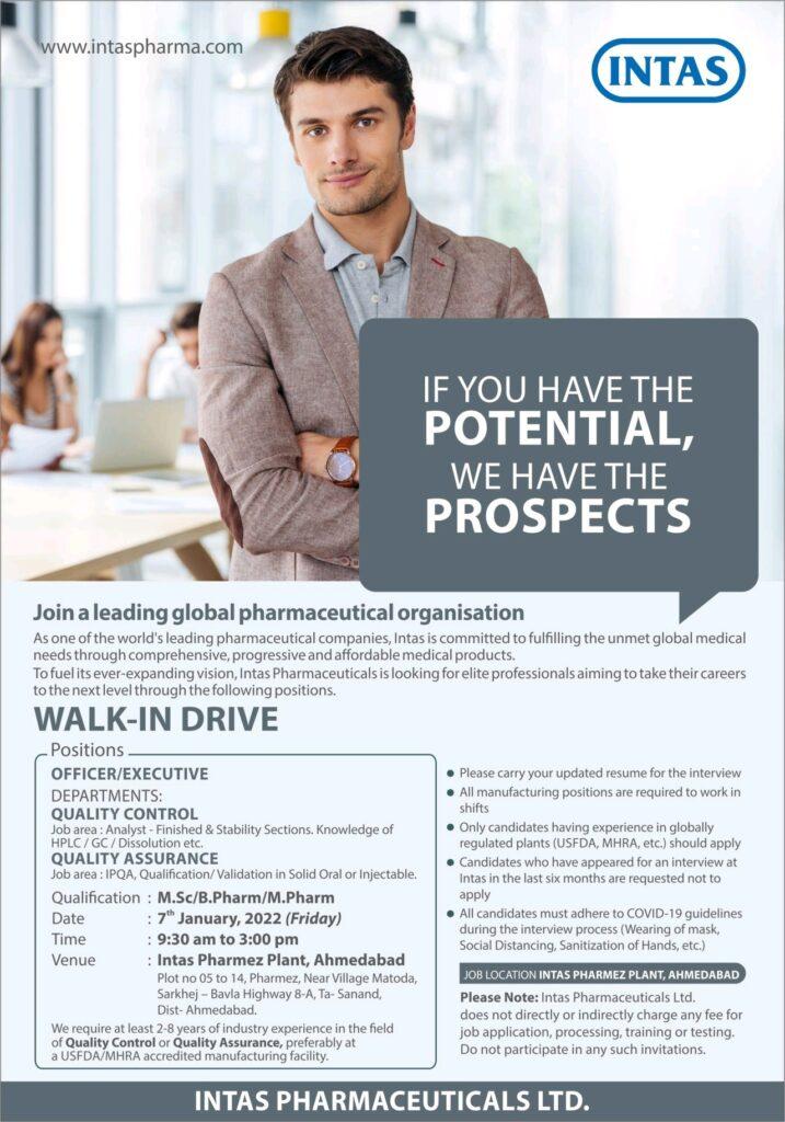 - Intas Pharmaceuticals Walk-In Drive 2026 | QC, Manufacturing & Engineering Jobs in Ahmedabad