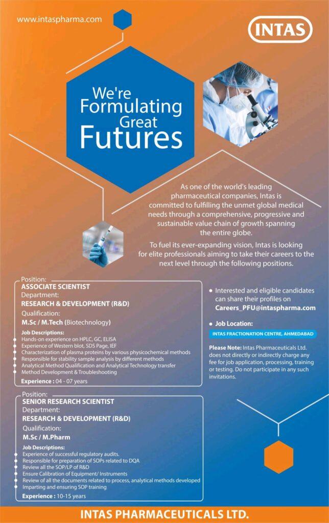 Please Note: Intas Pharmaceuticals Ltd. does not directly or indirectly charge any fee for job application, processing, training or testing. Do not participate in any such invitations.
