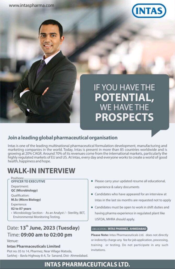 Please Note: Intas Pharmaceuticals Ltd. does not directly or indirectly charge any fee for job application, processing training of testing. Do not participate in any such Invitations