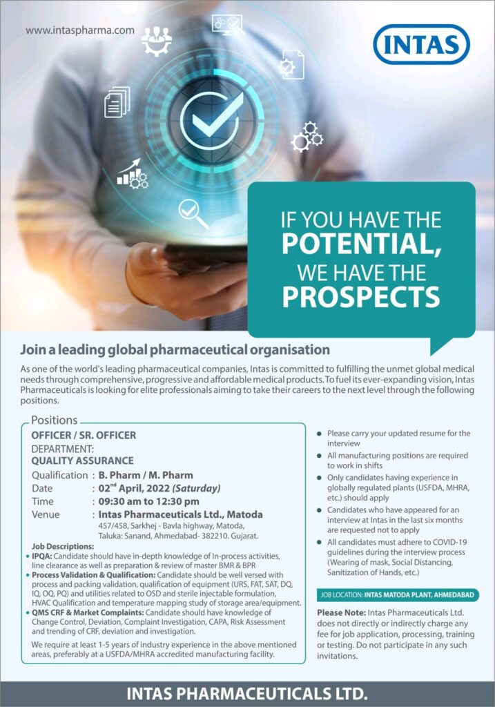 Please Note: Intas Pharmaceuticals Ltd. does not directly or indirectly charge any fee for job application, processing, training or testing. Do not participate in any such invitations.