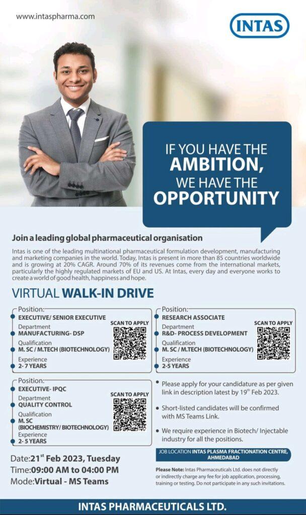 Intas Pharmaceuticals- Virtual Walk In Drive- Apply for your candidature before 19th February 2023