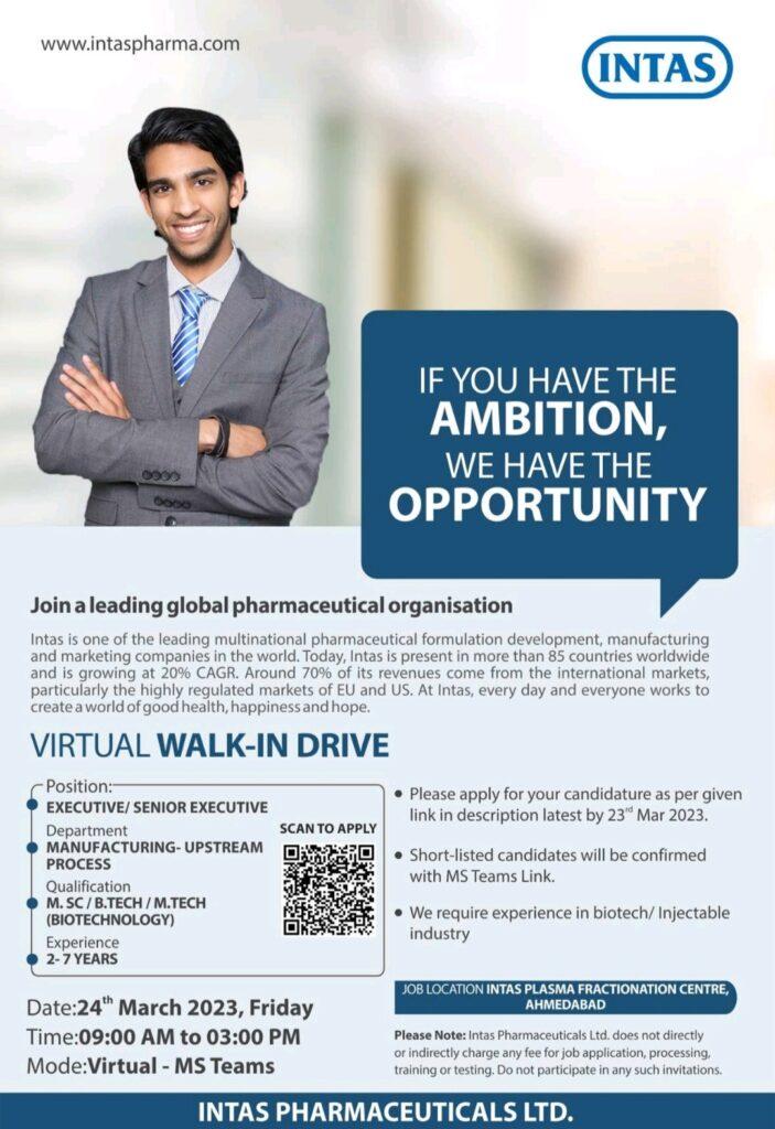 Intas Pharmaceuticals- Virtual Walk In Interview for Manufacturing- UpStream Process on 24th March 2023