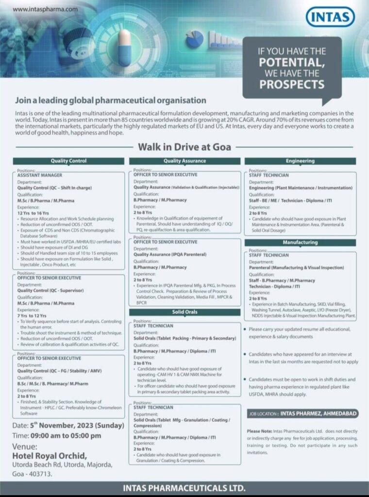Intas Pharmaceuticals Walk in Drive at Goa on 5th November, 2023 (Sunday)