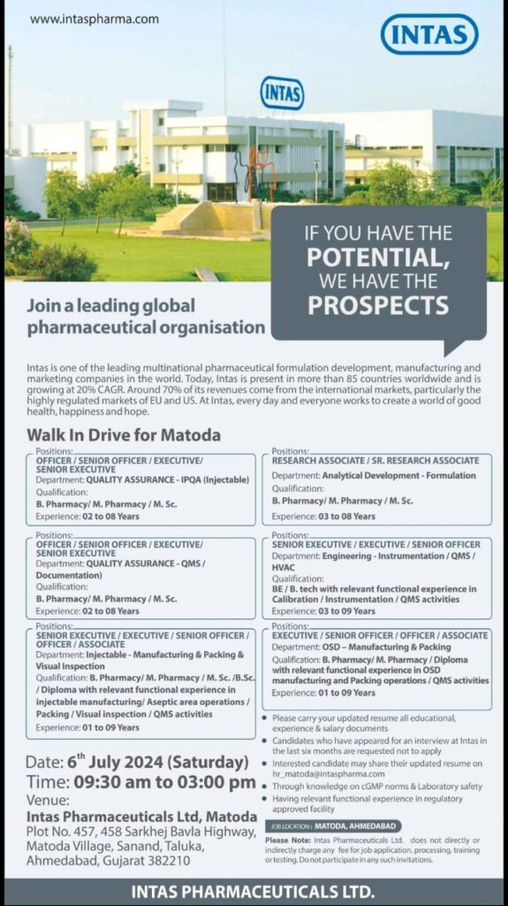 Intas Pharmaceuticals Walk In Drive for Injectable/ OSD – Quality Assurance (QMS/Documentation/ IPQA), Analytical Development, Manufacturing, Packing & Visual on 6th July 2024