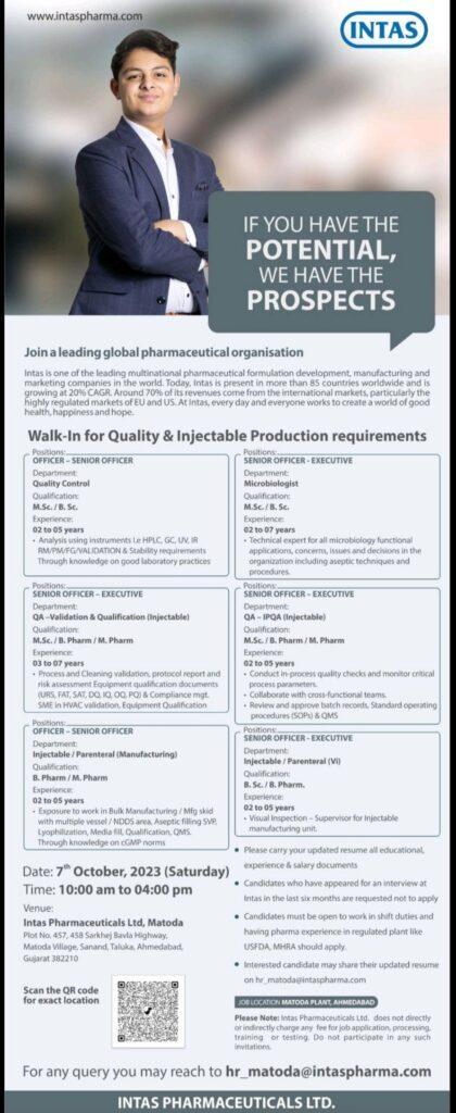 Intas Pharmaceuticals Walk In Drive for Quality & Injectable Production, Microbiologist, QA department on 7th October 2023