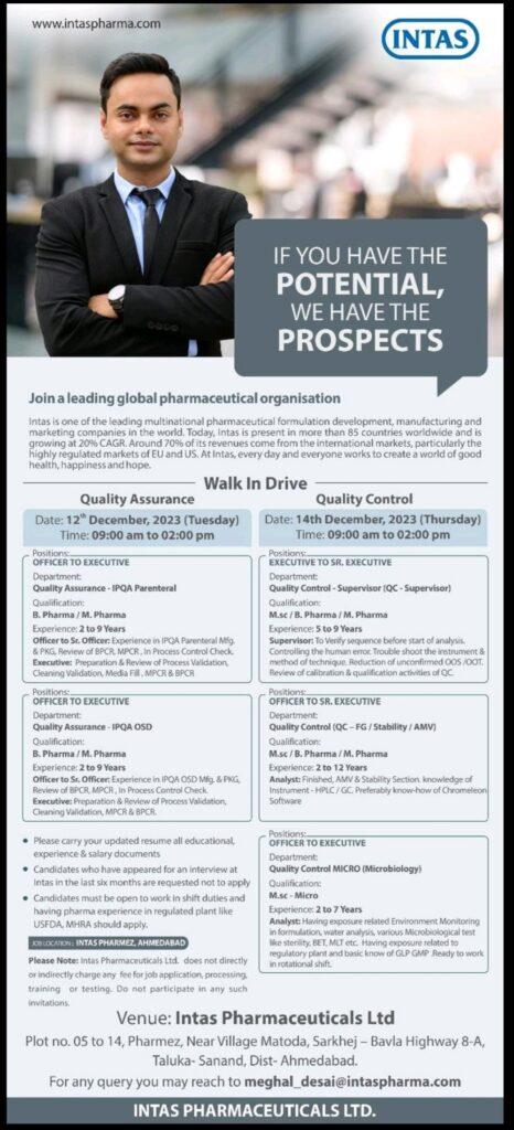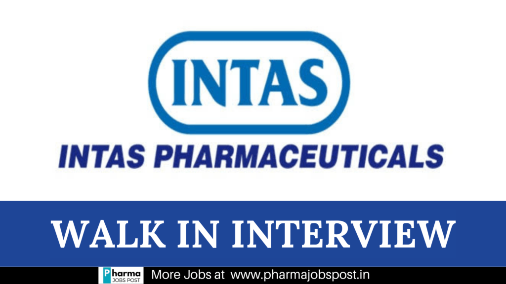 Intas Pharmaceuticals Walk In Drive on 12th & 14th December 2023 at Ahmedabad