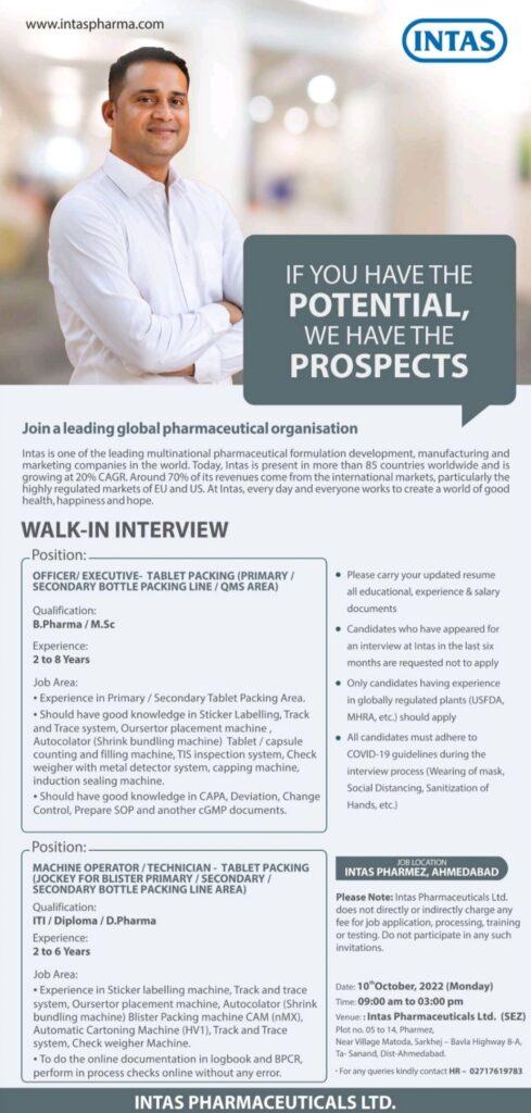 Intas Pharmaceuticals Walk In Interview for Machine Operator/ Technician/ Officer/Executive – Tablet Packing (Primary/Secondary Bottle Packing Line/ QMS Area) on 10th October 2022