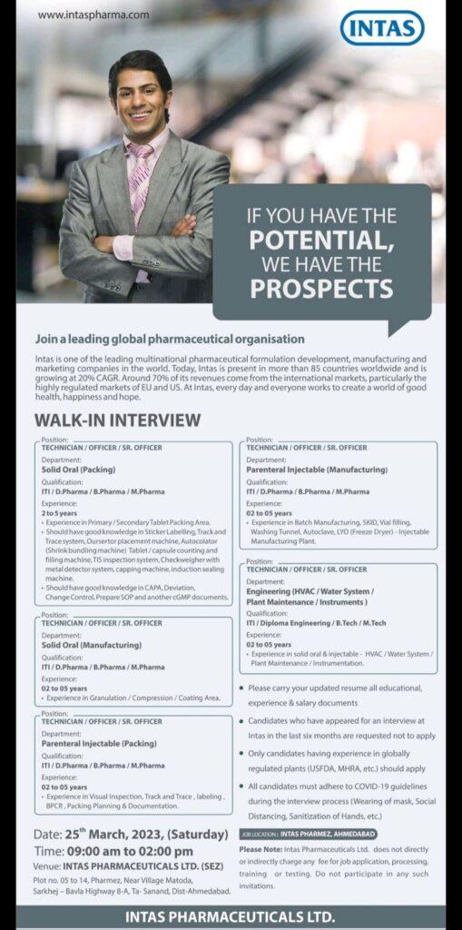 Intas Pharmaceuticals- Walk In Interview for multiple opening in OSD & Solid Oral- Manufacturing & Packing on 25th March 2023