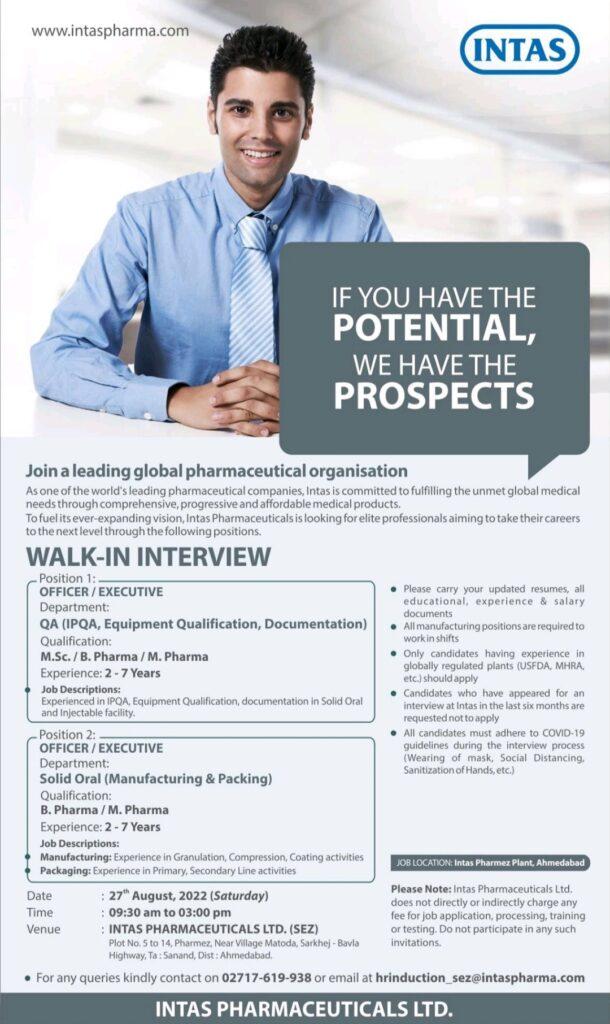 Please Note: Intas Pharmaceuticals Ltd. does not directly or indirectly charge any fee for job application, processing, training or testing. Do not participate in any such invitations.
