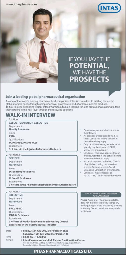 Please Note: Intas Pharmaceuticals Ltd. does not direcly or indirectly charge any fee for job application, processing, training or testing. Do not participate in any such Invitations