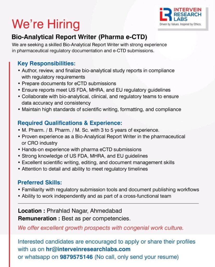 Intervein Research Labs, an organization driven by values and ethics, is currently seeking a skilled Bio-Analytical Report Writer (Pharma e-CTD) to join its team in Ahmedabad. This role is ideal for professionals with a strong background in pharmaceutical regulatory documentation and electronic Common Technical Document (e-CTD) submissions.