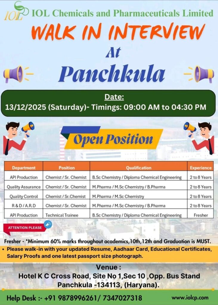 IOL Chemicals and Pharmaceuticals Limited, one of India’s leading API and specialty chemical manufacturers, has announced a major walk-in interview drive in Panchkula. The company is looking to hire skilled professionals for various technical positions across Production, Quality Assurance, Quality Control, and R&D.