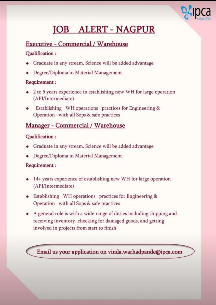 Ipca hiring Executive and Manager for Commercial/ Warehouse department at Nagpur location