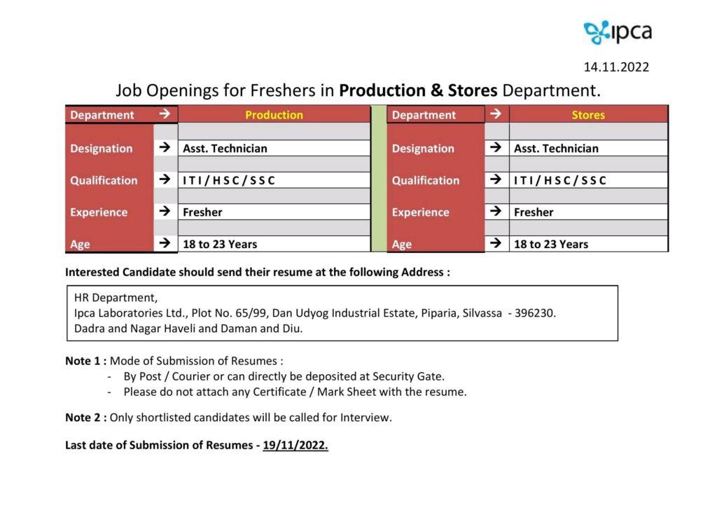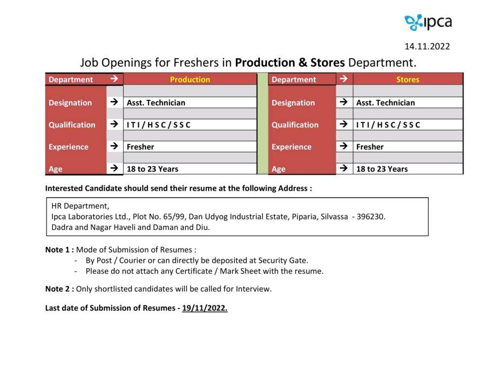 Ipca Job Openings for Freshers in Production & Stores Department – ITI/ HSC/ SSC candidate apply now