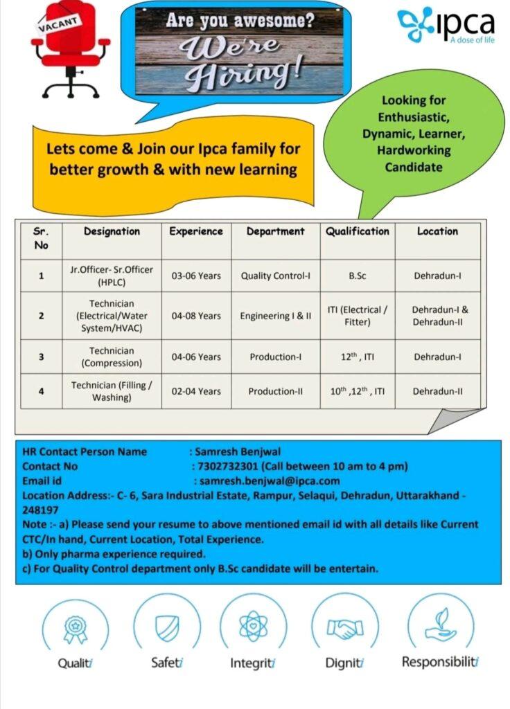Ipca job vacancy for Quality Control, Production & Engineering department
