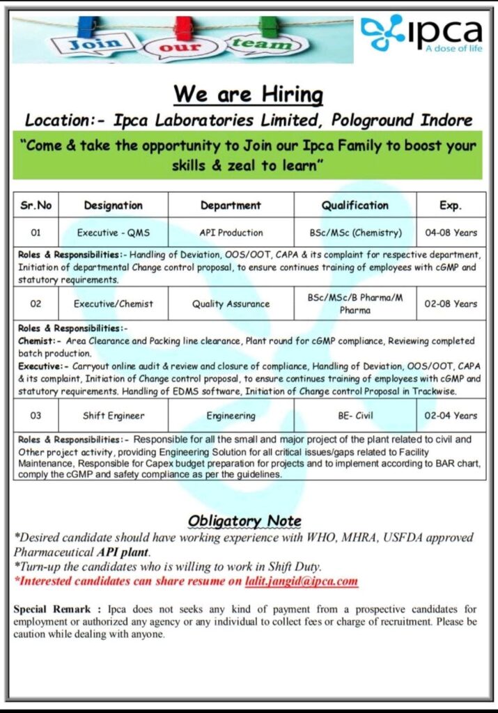 *Interested candidates can share resume on lalit.jangid@ipca.com