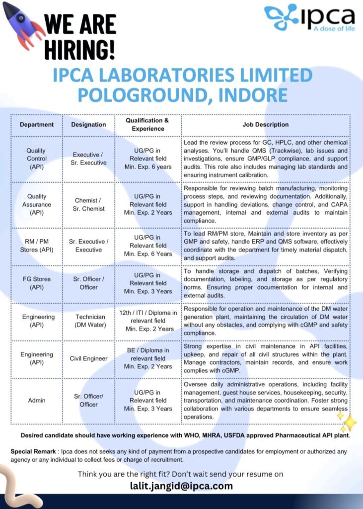 Interested candidates who meet the qualifications and experience criteria can send their resumes to lalit.jangid@ipca.com. The company has clarified that it does not seek any kind of payment from prospective candidates for employment and cautions against approaching unauthorized agencies.