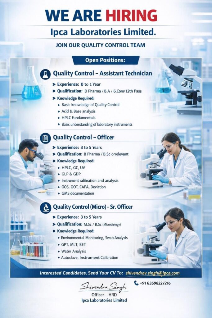 Are you looking to build or advance your career in the pharmaceutical industry? Ipca Laboratories Limited, a leader in the global pharmaceutical market, is currently expanding its Quality Control (QC) team. This is a fantastic opportunity for both freshers and experienced professionals to join a prestigious organization committed to high-quality healthcare.