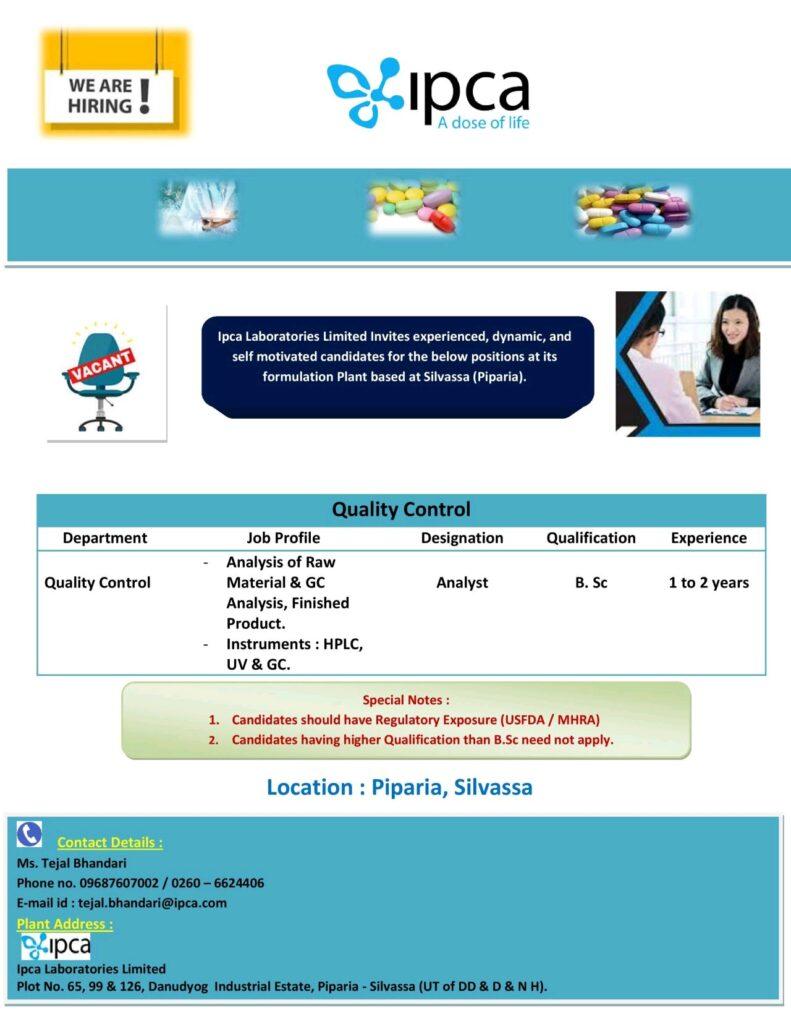 Ipca Laboratories- job vacancy for Quality Control department at Piparia, Silvassa