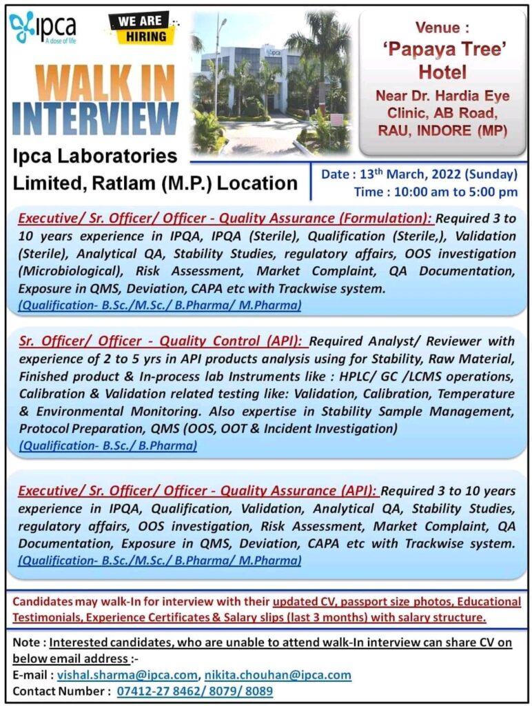 Note : Interested candidates, who are unable to attend walk-In interview can share CV on below email address:-E-mail : vishal.sharma@ipca.com, nikita.chouhan@ipca.com