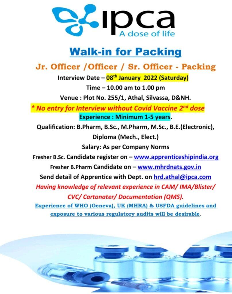 Ipca Laboratories Limited, Walk-In Interviews for Jr. Officer/ Officer/ Sr. Officer- Packing on 08th January 2022