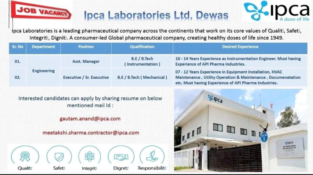 Ipca Laboratories Ltd., a globally recognized pharmaceutical company, has announced new job openings at its Dewas location in Madhya Pradesh. Since 1949, Ipca has been delivering high-quality healthcare solutions while maintaining its core values of Quality, Safety, Integrity, Dignity & Responsibility.