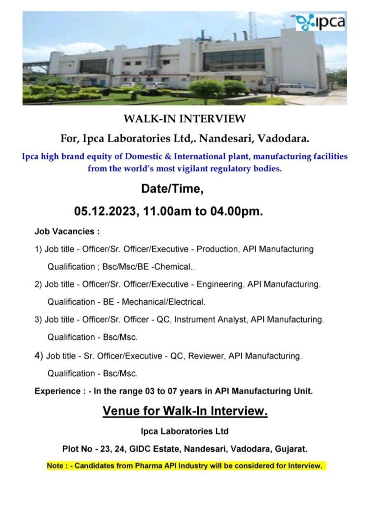 Ipca Laboratories Ltd,. Nandesari, Vadodara walk in interview on 05th December 2023