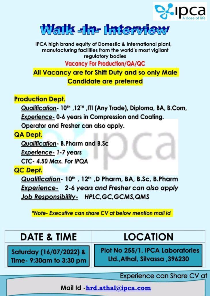 IPCA Laboratories Ltd. Vacancy For Production/ QA/ QC – Walk-in-Interview on 16th July 2022