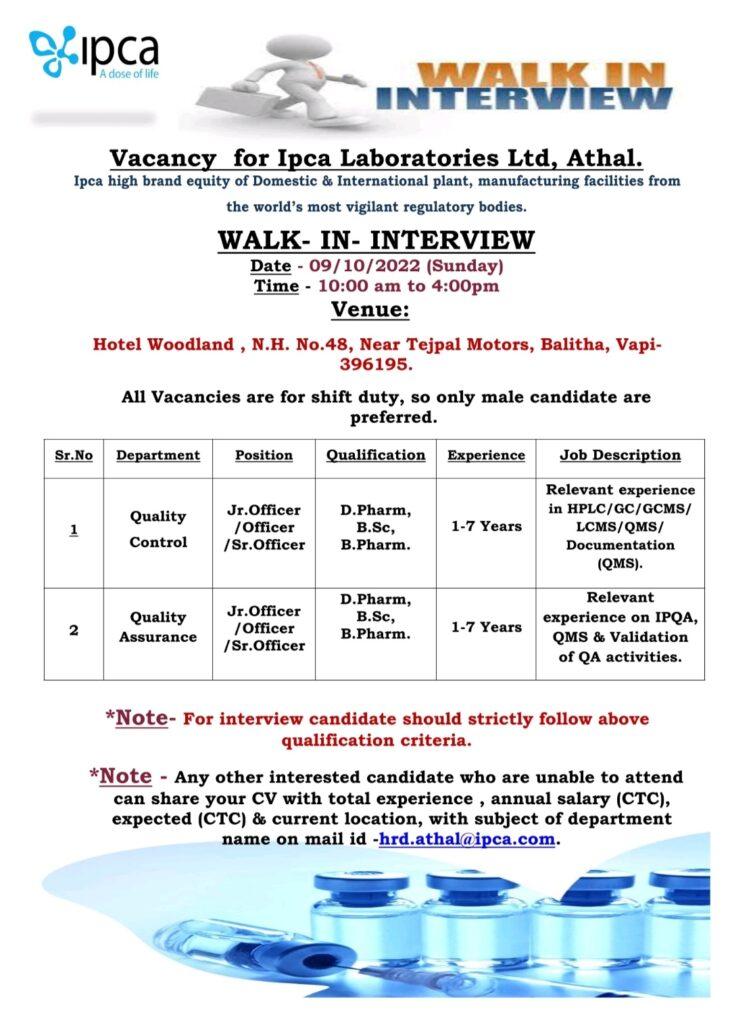 Ipca Laboratories Ltd Vacancy for Quality Control/ Quality Assurance department||Walk In Interview on 09/10/2022 (Sunday)