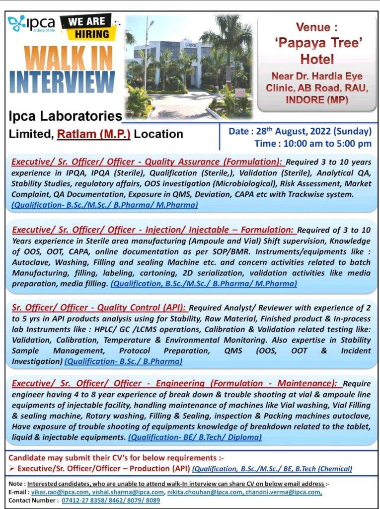 Note: Interested candidates, who are unable to attend walk-In interview can share CV on below email address : E-mail: vikas.rao@ipca.com, vishal.sharma@ipca.com, nikita.chouhan@ipca.com, chandni.verma@ipca.com,
