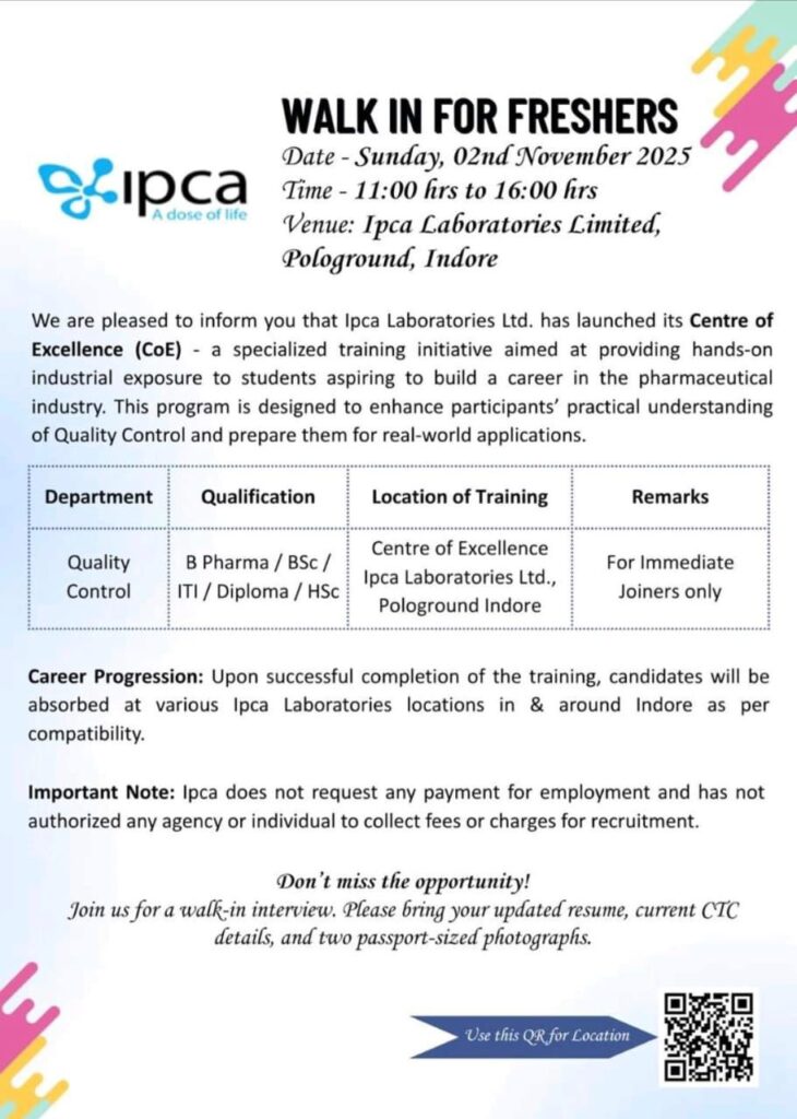 IPCA Laboratories Ltd., a leading global pharmaceutical company, is offering an excellent Centre of Excellence (CoE) Training Program for freshers who wish to build a strong career in the pharma industry.