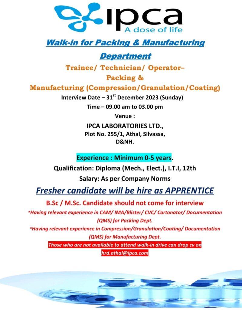 IPCA LABORATORIES Walk-in for Packing & Manufacturing Department on 31st December 2023 (Sunday)