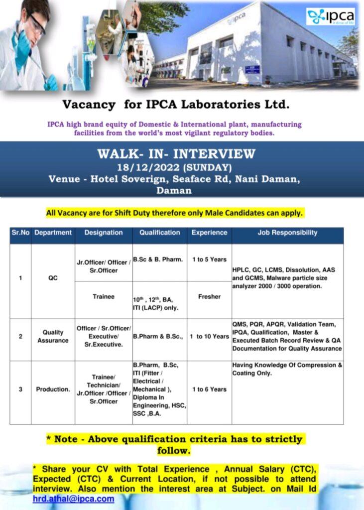 Vacancy for IPCA Laboratories Ltd. IPCA high brand equity of Domestic & International plant, manufacturing facilities from the world’s most vigilant regulatory bodies.