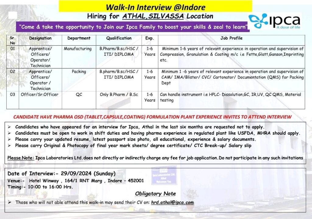 Ipca Laboratories is conducting a walk-in interview on 29th September 2024 in Indore for various positions including Apprentice, Officers, Operators, and Technicians in the Manufacturing, Packing, and Quality Control departments. Candidates with qualifications such as B.Sc., B.Pharm, ITI, Diploma, or HSC, and with 1 to 6 years of experience are eligible to apply. The job location is Athal, Silvassa, and those with experience in pharma formulations (e.g., tablets, capsules) in regulated plants like USFDA or MHRA are encouraged to attend.