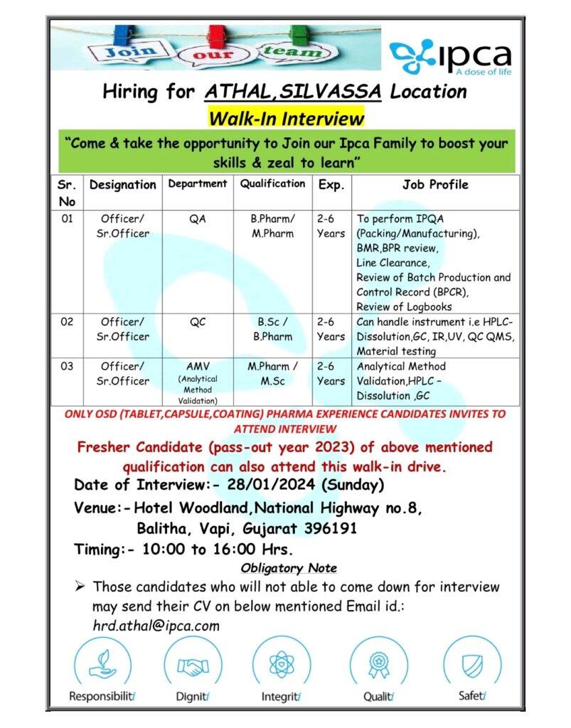 Ipca Walk-In Drive for QA, QC & AMV Department on Dt:28/01/2024 @ Vapi Location