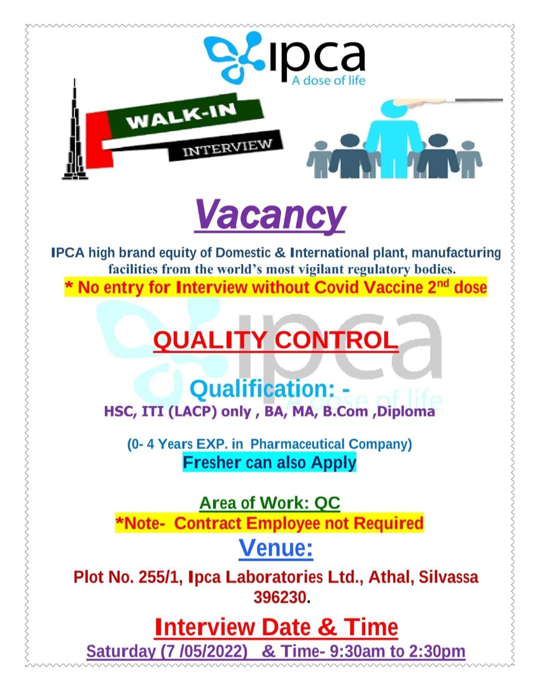 IPCA WALK-IN INTERVIEW for Freshers & experience HSC, ITI, BA, MA, B.Com, Diploma candidates in QC department on 07/05/2022