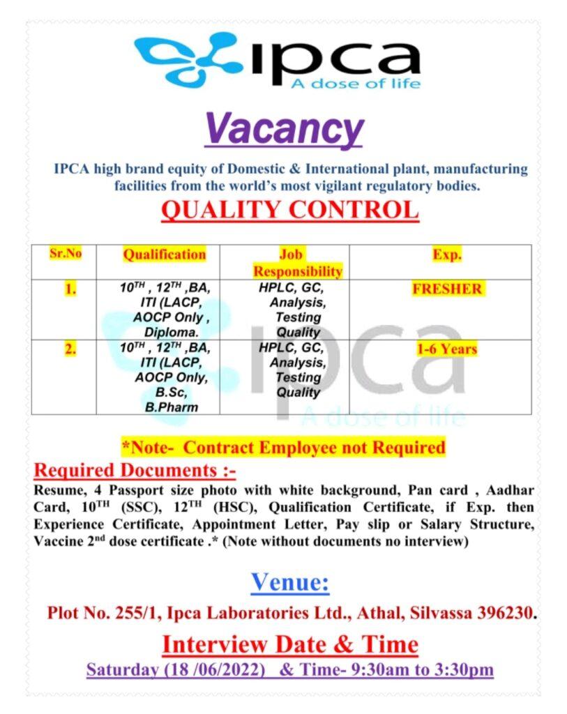 IPCA Walk In Interview for Freshers & experience in QC department on 18/06/2022
